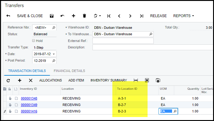 3. System will default to 1-step transfer type. Use 1-step for transfer between locations in the same warehouse.