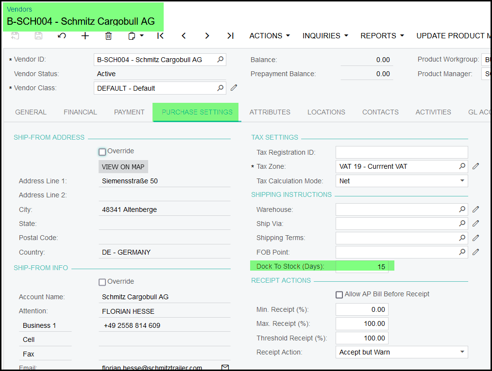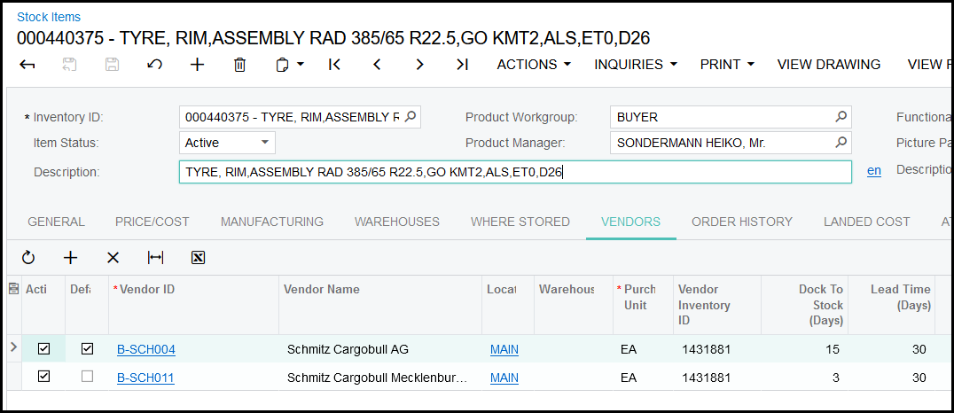 1. Lead time is setup per stock item per vendor on this screen. This the time the supplier takes to get the part or manufacture the part and when it will be ready for shipment to you.