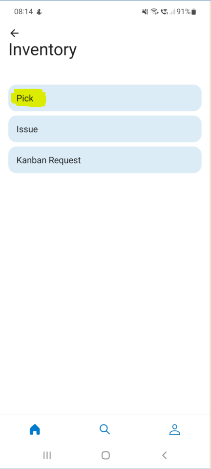 2. Here you can Pick per Location, Inventory Item, Production Order, Sales Order, Request or Work Center. Using the Mobile App gives you the ability to scan the Location and then Pick all the Inventory Items in that Location: