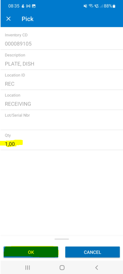 5. Acumatica gives you the ability to Pick either all of the quantities, for example 1.00, or you can amend the quantity that you are Picking as needed. Once you typed in the Quantity you want to Pick you tab on "OK":