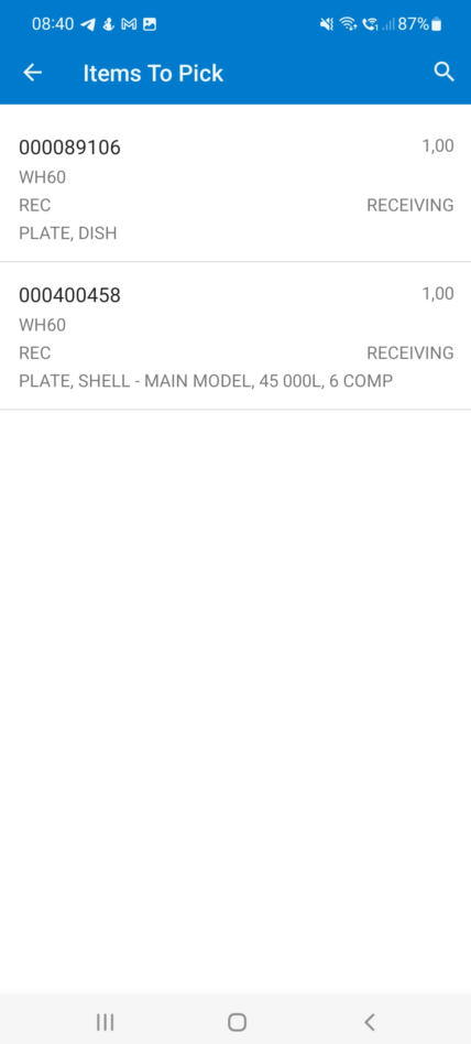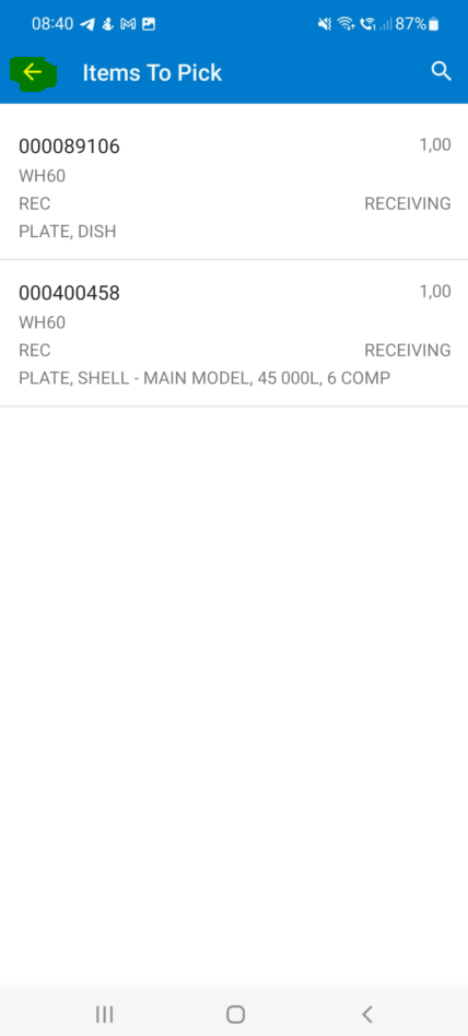 7. Once you have Picked all the Items in the Location you can tab on the "Back" icon and scan a new Location and Repeat Steps 2 to 6: