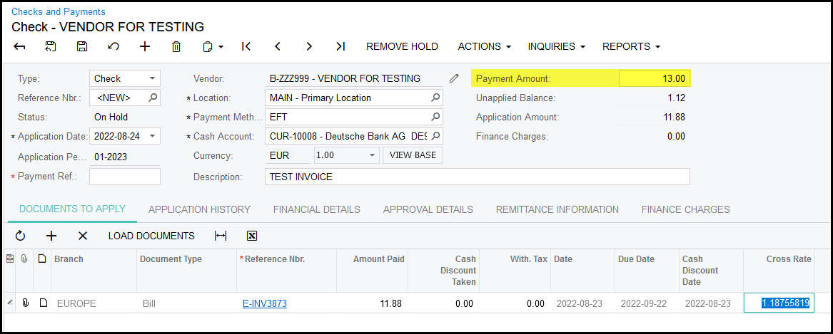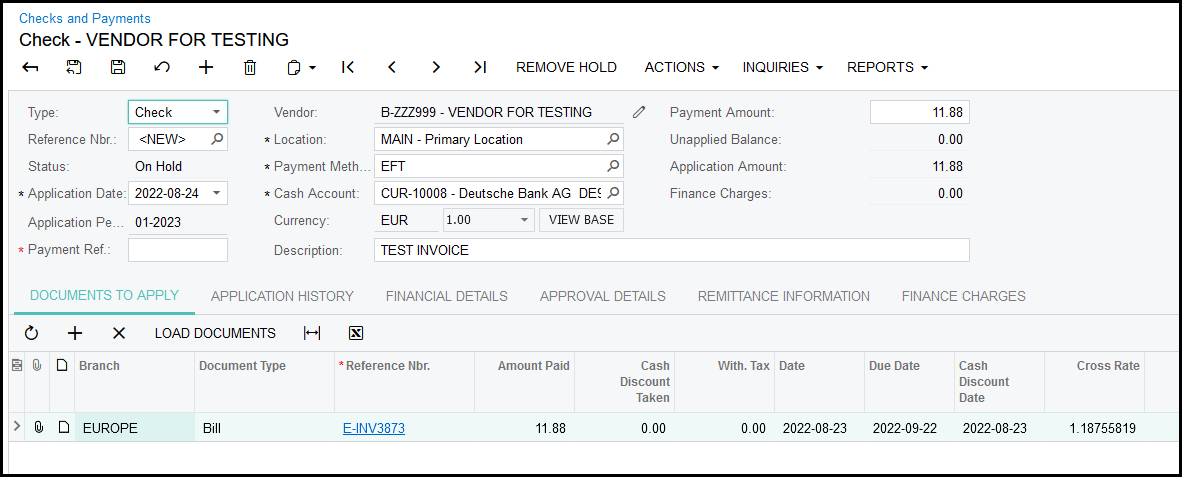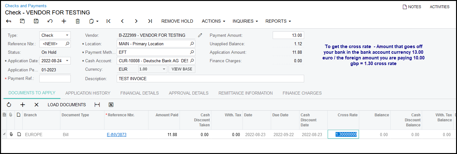 2. You are paying this invoice from your Euro bank account. Click on PAY when on the invoice, this will open the Checks and Payment screen. The invoice with show in Euro's at the converted amount on the transaction date it was processed.