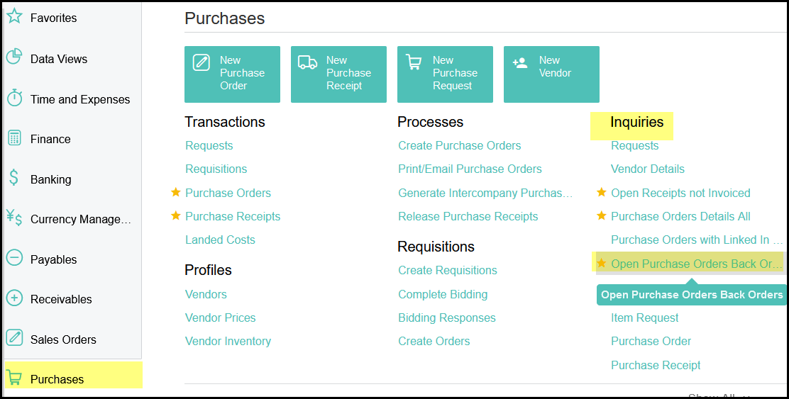 2. Go to Purchases>Inquiries>Open Purchase Orders Back Orders