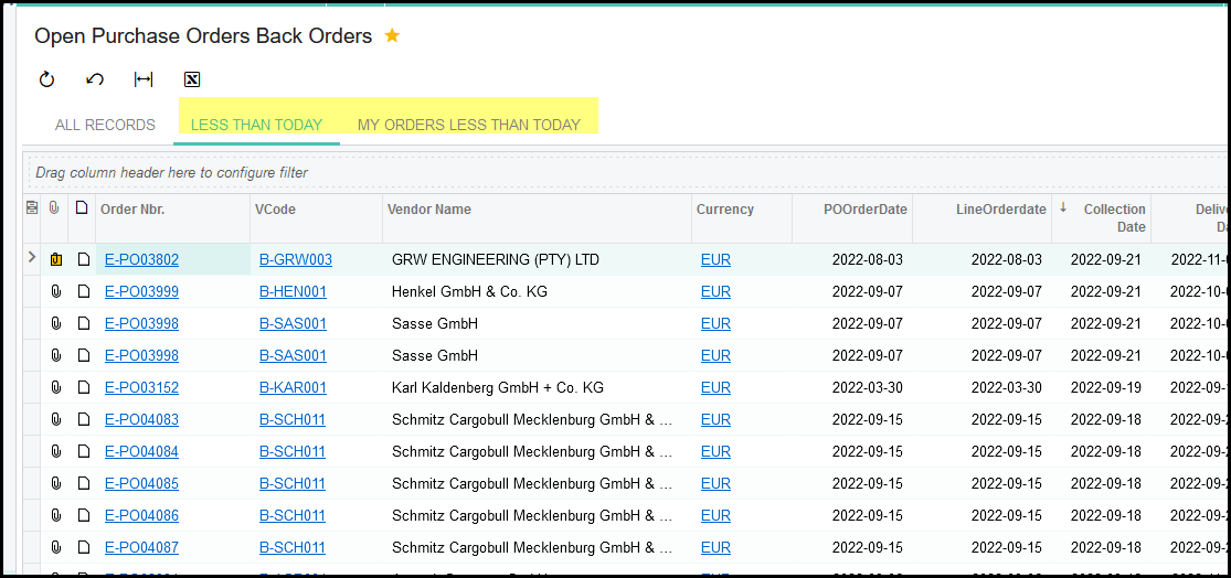 5. 'MY ORDERS LESS THAN TODAY' - all open line with a collection date of today and earlier that was created by myself.