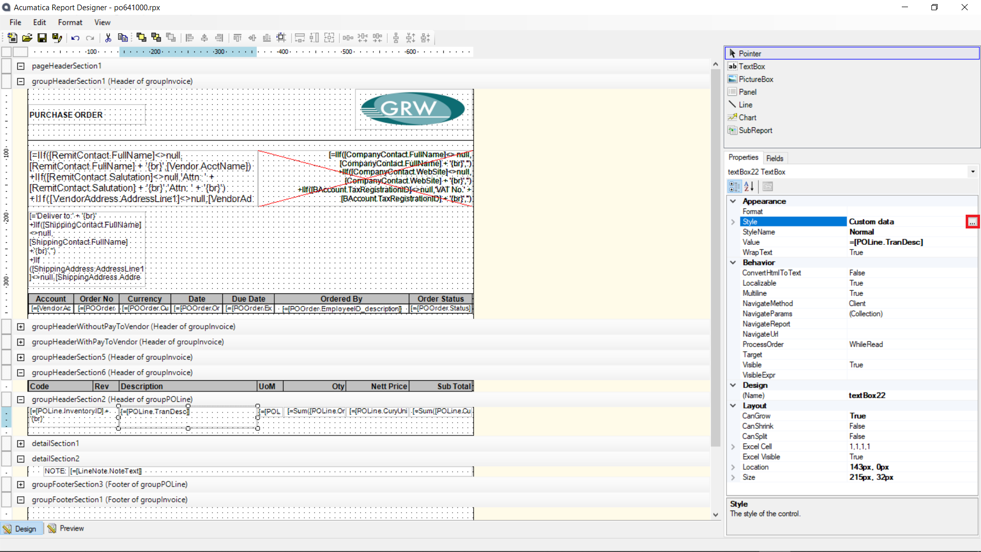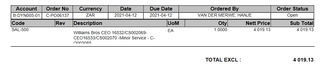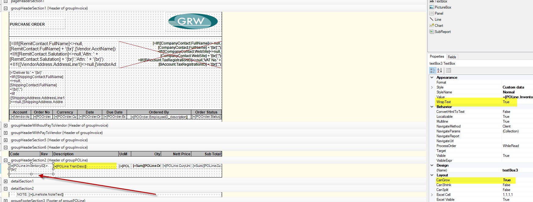 Maar kyk gou hieronder, die description is op wrap en can go gestel. Al wat ek wel sien is dat die Code se breedte/height redelik wyer is sien in rooi, nou wonder ek kan ek dit doen by die description of moet alle headers dan soos die Uom en Qty en Nett price en als dan so gestel word?