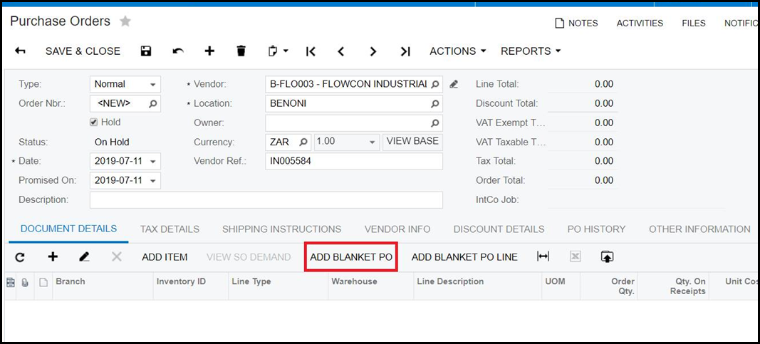 5. On your normal PO, go to 'ADD BLANKET PO'