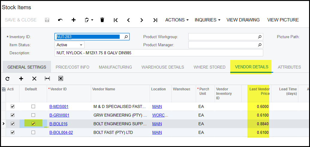 - Also under the item code you can view the tab vendor details - this tab will show the suppliers that the item has been purchased from and the last purchased price from that vendor.