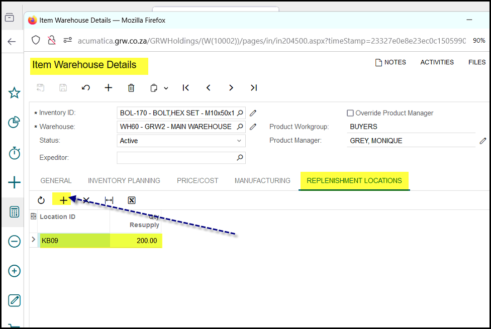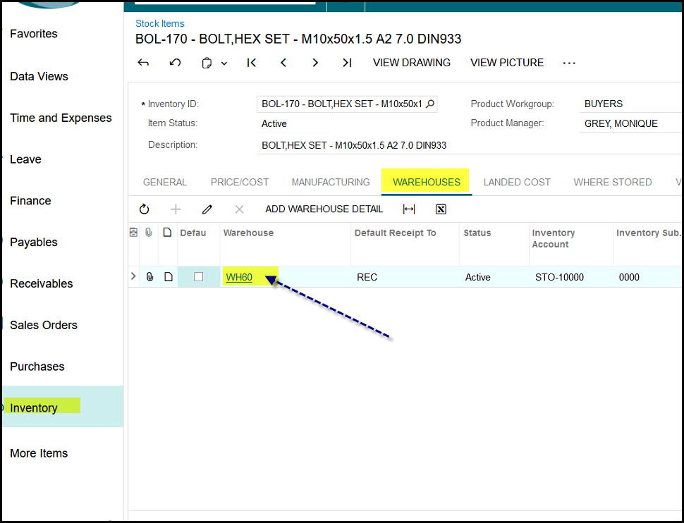 3. Click on the warehouse tab and on WH60 of the item, this opens the Item warehouse details screen.