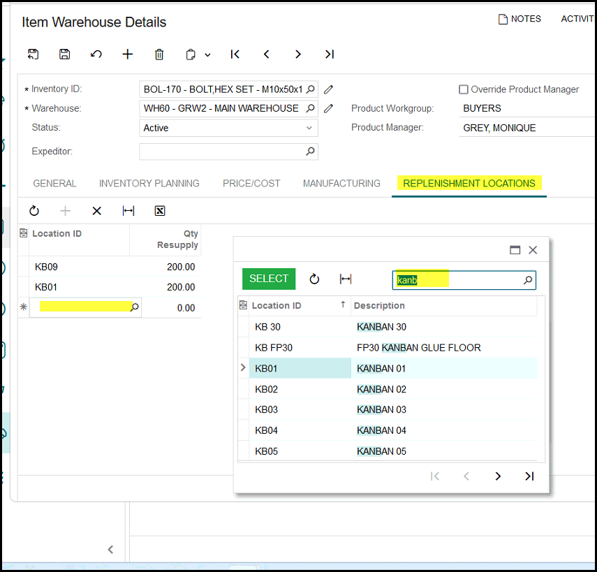 5. Click on the search and the words 'kanb' then all the kanban locations will pop-up. Select the location that you want to add.