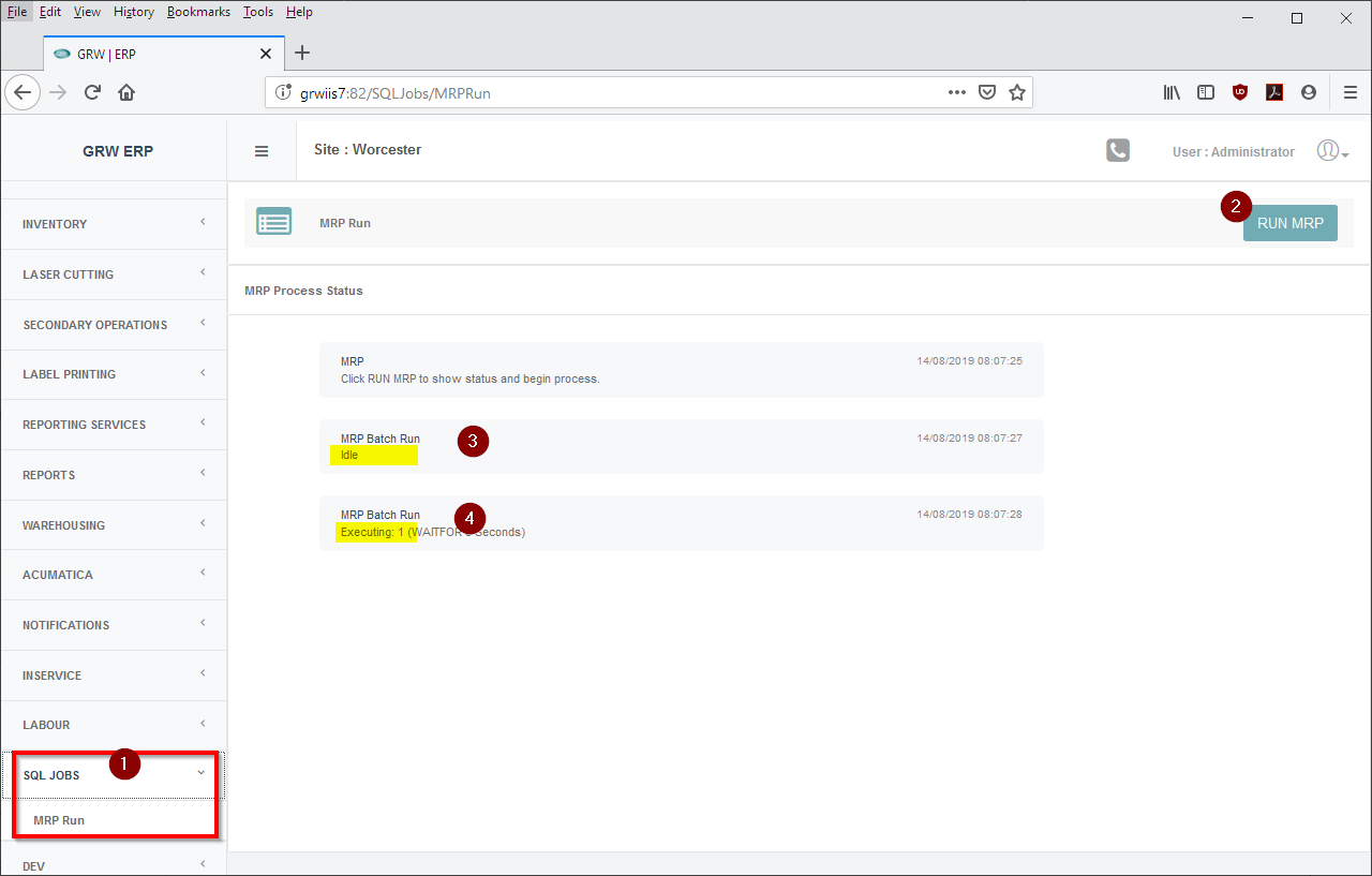 - If the MRP job is currently running and another MRP run is started, the returned message will read "Executing...". Only one MRP job can be executing at one time.