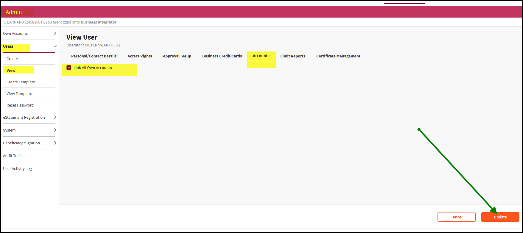 4. Tick the box 'link all own accounts' and update.