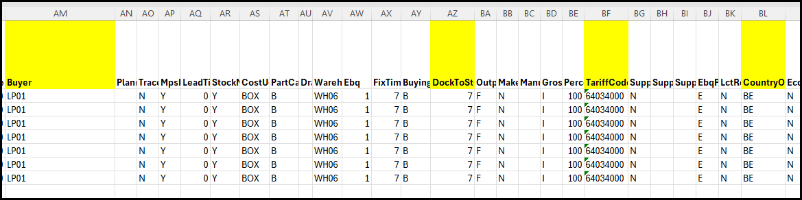 Column AM - Buyer - the buyer code in Syspro (ask for the code from the ERP team if you are not sure)