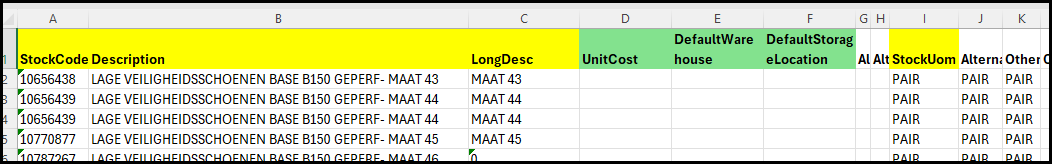 Column F - DefaultStorageLocation - the default location/bin where the stock is stored (the location should be in the
