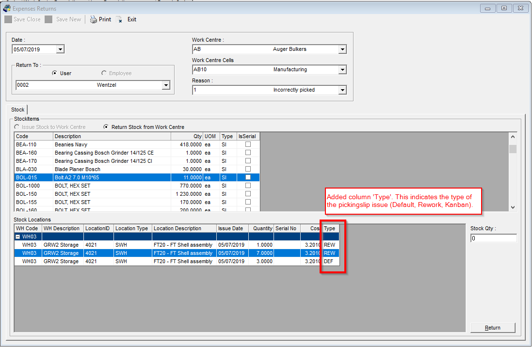 - Added 'Type' to Expense Returns. If a return is done against a REW (rework) issue, then the EXPR_RW transaction will execute.