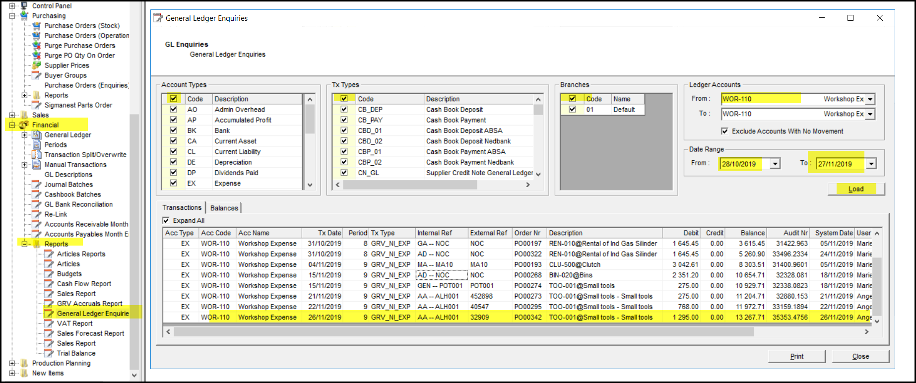 3. First you have to go to your PO to see which stock item was used with the GRV to see what general ledger was affected.