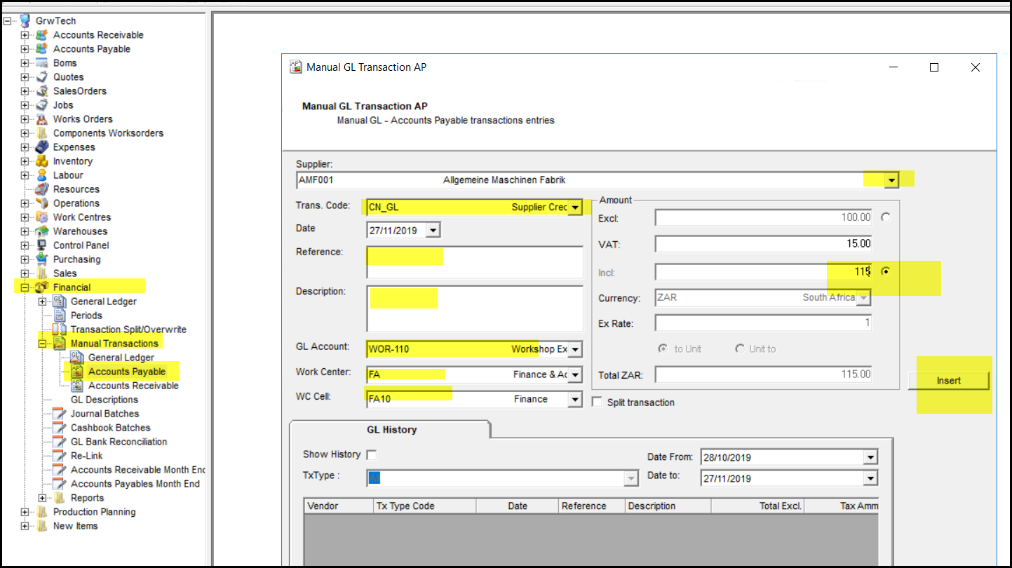15. Select your supplier and choose CN_GL complete the rest of the info and choose the correct general ledger account which in this case is WOR-110.