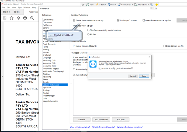 2. Go to pdf preferences or properties > advanced settings > security > the enable protected mode should not be ticked.