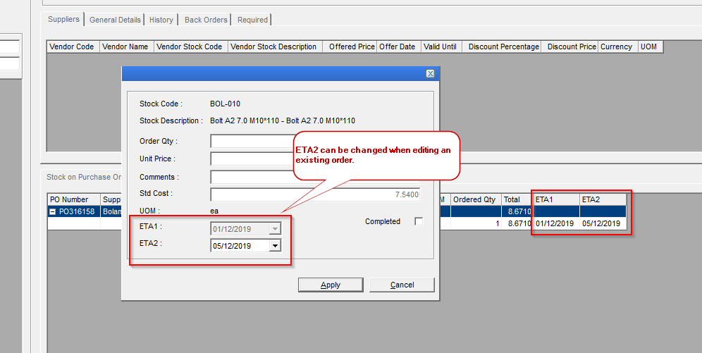 - ETA2 will be set to ETA1 when the order is saved for the first time.