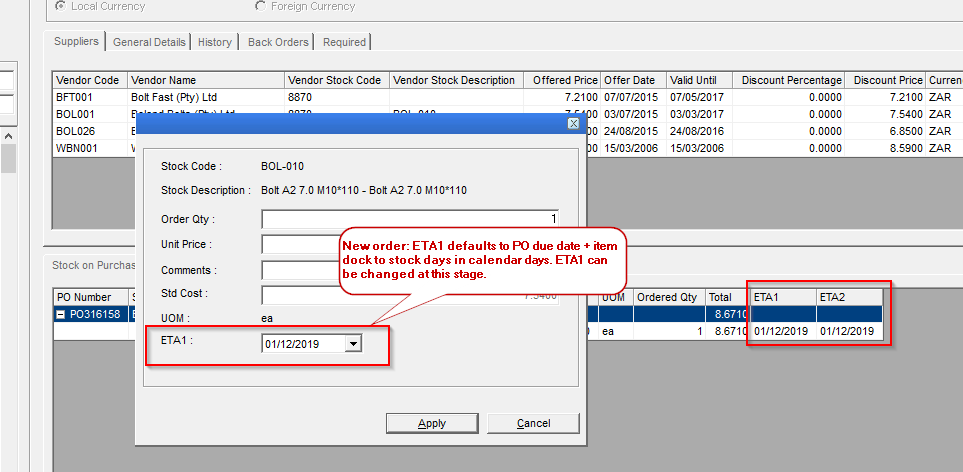 - When creating a new PO, ETA1 will default to the order due date + dock to stock days in calendar days.